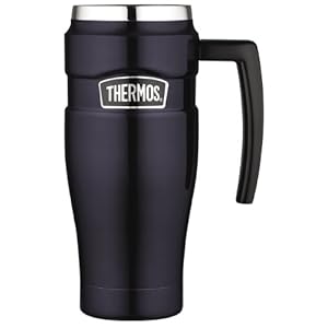 The ultra-durable, leak-proof Thermos Stainless King travel mug with handle features an unbreakable stainless steel interior and exterior, making it a great companion for use in rough-and-tumble situations such as construction sites, delivery work, and more. Offering a 16-ounce capacity, the Stainless King features Thermos' TherMax double wall vacuum insulation that locks in temperature to preserve flavor and freshness--it stays cool to the touch with hot beverages and is condensation-free with cold. The contoured body is comfortable to hold and fits most automobile drink holders. Hand wash only.